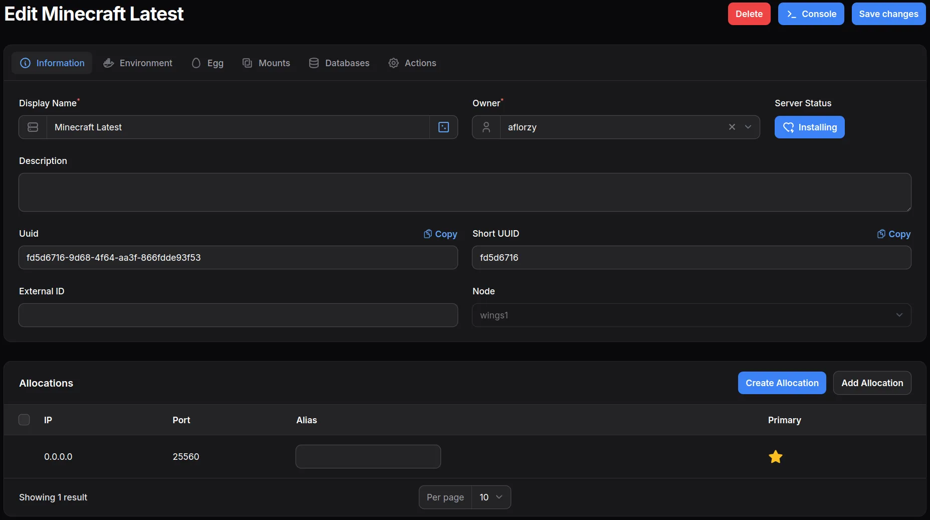Time to create a server! The first step for doing this is to create port allocations on your node. Navigate to the Nodes tab and click on your node. Scroll down to the Allocations section and click “Create Allocations”.